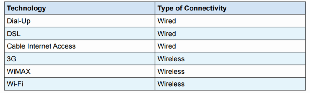 Answer: Broadly Internet connectivity is categorized into two categories – (i) Wired and (ii) Wireless.