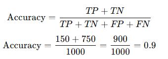 Accuracy = (TP + TN) / (TP + TN + FP + FN)