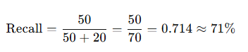 - In a binary classification problem, a model predicts 50 instances as positive, out of which 70 are actually positive. What is the recall of the model?
