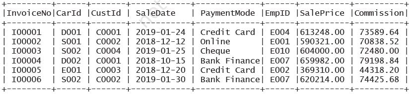 |invoiceno |carid | custid | saledate | paymentmode | empid | saleprice | Commission |
